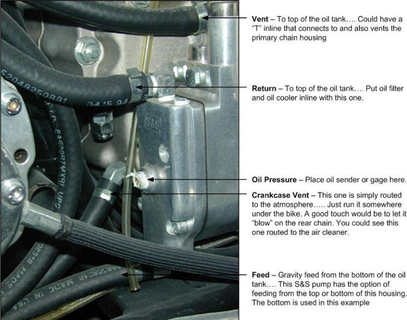 There are many other differences, but those presented here are perhaps the most significant. Shovelheads can be constructed to be more powerful and more reliable than any Evo. Many racers prefer the shovelhead because it is easier to modify and capable of tremendous extremes of operation. You can get an incredible variety of specialized parts, including high performance cases, pistons, valves, heads and cams for shovelheads. The engine ain't dead by any means, and is considered by many to be the best motor Harley Davidson ever made. In racing applications shovelhead cylinders distort less than Evo cylinders because the shovelhead jugs are made of cast iron. When under extreme stress, Evo cylinders (made of aluminum) tend to change their shape due to unequal stress distribution around the head bolts. This results in "blow by" between piston rings and the cylinder wall, and a reduction in power that gets transferred to the pistons. This is a major reason for the desirability of shovelhead motors in racing. Although the Evo has higher tolerances, the Shovelhead can be worked on in a home garage without the need for high tolerancing machine tools. In this respect, the Shovelhead is the last HD motor to be designed for the "farm-hand". You can wrench the whole thing yourself! (With a little experience.) The Evolution engine has earned a reputation for being more "reliable." In reality, the Evo is indeed a little more reliable, but a poorly maintained Evo will be much less reliable than a well maintained shovelhead. The difference is that when the Evo gets out of whack you probably won't be able to fix it yourself. You don't need to remove the Shovelhead motor from the frame to remove the heads or jugs. This means you can inspect and replace valves, guides and heads as necessary. You can even hone your own cylinders! The Evo may be more "reliable" but it is also closer to the philosophy of "no user-serviceable parts inside." The twin-cam 88 is even less user-servicable. You need lots of special tools to work on any HD motor after the introduction of the Evo. So, you may need to change oil more often, and re-torque bolts, and deal with wear in your valve guides, but you can do these things yourself instead of paying an expensive company mechanic. If you are of the philosophy that a big part of riding a bike is being constantly, intimately aware of how it is functioning, you may find a good set of tools and a well set up Shovelhead motor is just the ticket. Bottom line is what you do when you are stuck by the side of the road and can't take anything apart with limited tools. Evo riders wait for the tow truck. Shovel riders can unbolt stuff and make repairs. Shovelhead Oil Pump and Line Routing Example